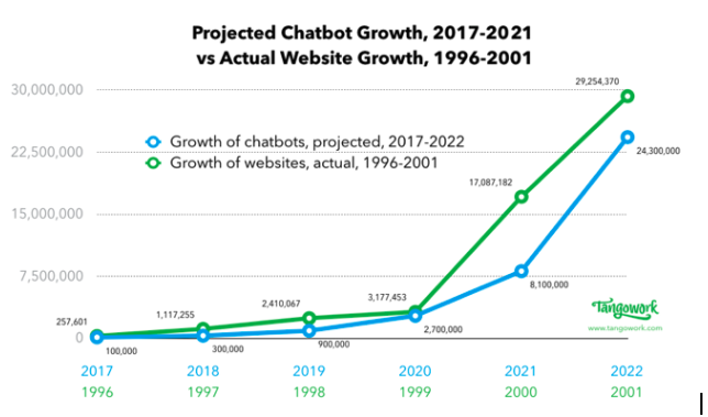Projected chatbot growth based on 200% growth rate. Historical website statistics from Internet Live Stats.