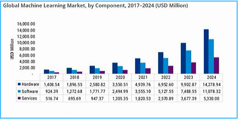 - The global Machine Learning market is estimated to reach a whopping $20.83B in 2024 from $1.58B in 2017. The CAGR so registered is expected to shoot up high at 44.06% between the time period 2017 and 2024.