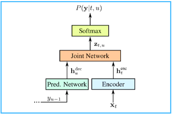 The illustration given above catches the exact principle of the working of RNN-T. With the help of the feedback loop, the RNN-T recognizer outputs characters one after the other which consumes symbols analyzed in advance by the model back into it to anticipate which symbol is to follow.