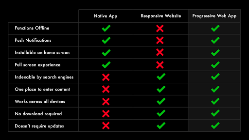 The above illustration is a snapshot of the major differences in a native app V/s a responsive website and of course a progressive web application.
